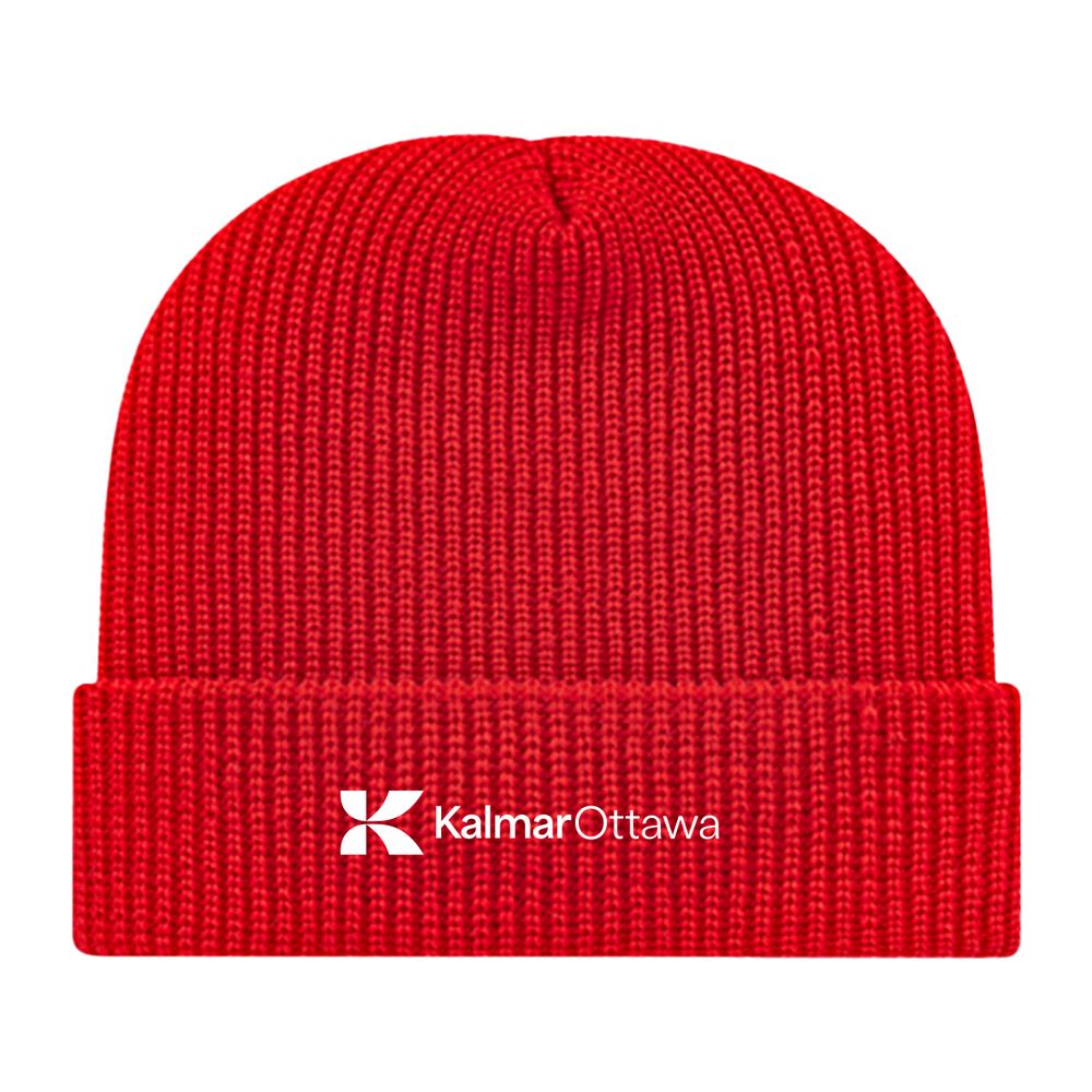 Red 100% acrylic full rib knit cap with cuff, One Size Fits Most.